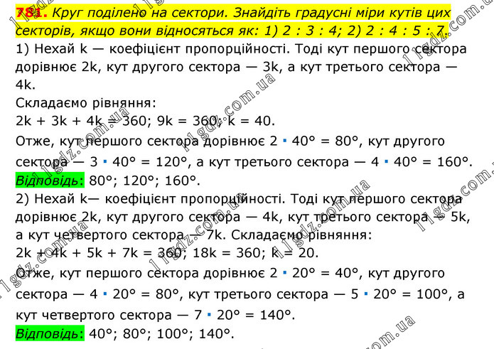 Круг поділено на сектори. Знайдіть градусні міри кутів цих секторів, якщо вони відносяться як: 1) 2 : 3 : 4; 2) 2 : 4 : 5 : 7. 1) Нехай k — коефіцієнт пропорційності. Тоді кут першого сектора дорівнює 2k, кут другого сектора — 3k, а кут третього сектора — 4k. Складаємо рівняння: 2k + 3k + 4k = 360; 9k = 360; k = 40. Отже, кут першого сектора дорівнює 2 ∙ 40° = 80°, кут другого сектора — 3 ∙ 40° = 120°, а кут третього сектора — 4 ∙ 40° = 160°. Відповідь: 80°; 120°; 160°. 2) Нехай k— коефіцієнт пропорційності. Тоді кут першого сектора дорівнює 2k, кут другого сектора — 4k, кут третього сектора — 5k, а кут четвертого сектора — 7k. Складаємо рівняння: 2k + 4k + 5k + 7k = 360; 18k = 360; k = 20. Отже, кут першого сектора дорівнює 2 ∙ 20° = 40°, кут другого сектора — 4 ∙ 20° = 80°, кут третього сектора — 5 ∙ 20° = 100°, а кут четвертого сектора — 7 ∙ 20° = 140°. Відповідь: 40°; 80°; 100°; 140°.