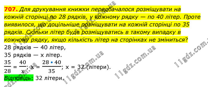 Для друкування книжки передбачалося розміщувати на кожній сторінці по 28 рядків, у кожному рядку — по 40 літер. Проте виявилося, що доцільніше розміщувати на кожній сторінці по 35 рядків. Скільки літер буде розміщуватись в такому випадку в кожному рядку, якщо кількість літер на сторінках не зміниться? 28 рядків — 40 літер, 35 рядків — х літер. 35/28 = 40/х; х = (28 • 40)/35; х = 32 (літери). Відповідь: 32 літери.