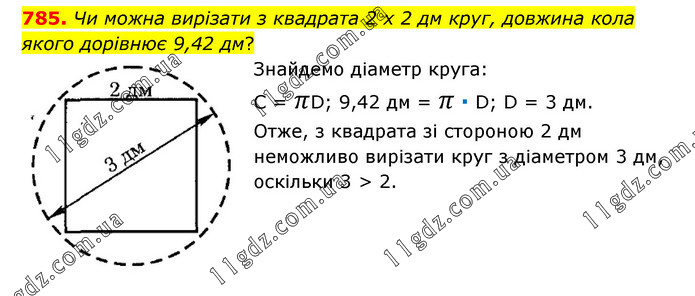Чи можна вирізати з квадрата 2 х 2 дм круг, довжина кола якого дорівнює 9,42 дм? Знайдемо діаметр круга: С = πD; 9,42 дм = π ∙ D; D = 3 дм. Отже, з квадрата зі стороною 2 дм неможливо вирізати круг з діаметром 3 дм, оскільки 3 > 2.