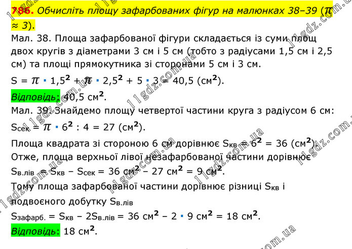 Обчисліть площу зафарбованих фігур на малюнках 38–39 (π ≈ 3). Мал. 38. Площа зафарбованої фігури складається із суми площ двох кругів з діаметрами 3 см і 5 см (тобто з радіусами 1,5 см і 2,5 см) та площі прямокутника зі сторонами 5 см і 3 см. S = π ∙ 1,52 + π ∙ 2,52 + 5 ∙ 3 = 40,5 (см2). Відповідь: 40,5 см2. Мал. 39. Знайдемо площу четвертої частини круга з радіусом 6 см: Sсек = π ∙ 62 : 4 = 27 (см2). Площа квадрата зі стороною 6 см дорівнює Sкв = 62 = 36 (см2). Отже, площа верхньої лівої незафарбованої частини дорівнює Sв.лів = Sкв – Sсек = 36 см2 – 27 см2 = 9 см2. Тому площа зафарбованої частини дорівнює різниці Sкв і подвоєного добутку Sв.лів Sзафарб. = Sкв – 2Sв.лів = 36 см2 – 2 ∙ 9 см2 = 18 см2. Відповідь: 18 см2.