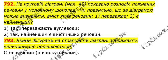 792. На круговій діаграмі (мал. 49) показано розподіл поживних речовин у молочному шоколаді. Чи правильно, що за діаграмою можна визначити, вміст яких речовин: 1) переважає; 2) є найменшим? 1) Так, переважають вуглеводи; 2) так, найменшим є вміст інших речовин. 793. Якими фігурами на стовпчастій діаграмі зображають величини, що порівнюються? Стовпчиками (прямокутниками).