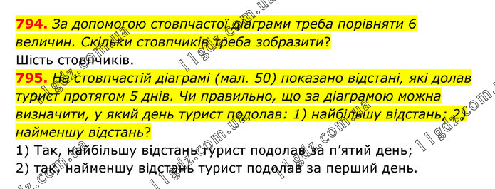 794. За допомогою стовпчастої діаграми треба порівняти 6 величин. Скільки стовпчиків треба зобразити? Шість стовпчиків. 795. На стовпчастій діаграмі (мал. 50) показано відстані, які долав турист протягом 5 днів. Чи правильно, що за діаграмою можна визначити, у який день турист подолав: 1) найбільшу відстань; 2) найменшу відстань? 1) Так, найбільшу відстань турист подолав за п’ятий день; 2) так, найменшу відстань турист подолав за перший день.