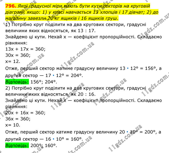 Якої градусної міри мають бути кути секторів на круговій діаграмі, якщо: 1) у класі навчається 13 хлопців і 17 дівчат; 2) до магазину завезли 20 кг ящиків і 16 ящиків груш. 1) Потрібно круг поділити на два кругових сектори, градусні величини яких відносяться, як 13 : 17. Знайдемо ці кути. Нехай х — коефіцієнт пропорційності. Складаємо рівняння: 13х + 17х = 360; 30х = 360; х= 12. Отже, перший сектор матиме градусну величину 13 ∙ 12° = 156°, а другий сектор — 17 ∙ 12° = 204°. Відповідь: 156°; 204°. 2) Потрібно круг поділити на два кругових сектори, градусні величини яких відносяться, як 20 : 16. Знайдемо ці кути. Нехай х — коефіцієнт пропорційності. Складаємо рівняння: 20х + 16х = 360; 36х = 360; х= 10. Отже, перший сектор катиме градусну величину 20 ∙ 10° = 200°, а другий сектор — 16 ∙ 10° = 160°. Відповідь: 200°; 160°.