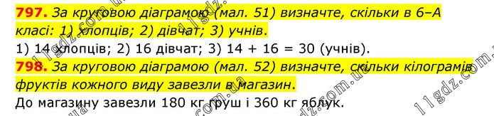 797. За круговою діаграмою (мал. 51) визначте, скільки в 6–А класі: 1) хлопців; 2) дівчат; 3) учнів. 1) 14 хлопців; 2) 16 дівчат; 3) 14 + 16 = 30 (учнів). 798. За круговою діаграмою (мал. 52) визначте, скільки кілограмів фруктів кожного виду завезли в магазин. До магазину завезли 180 кг груш і 360 кг яблук.
