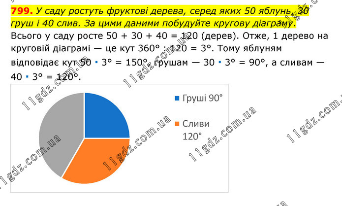 У саду ростуть фруктові дерева, серед яких 50 яблунь, 30 груш і 40 слив. За цими даними побудуйте кругову діаграму. Всього у саду росте 50 + 30 + 40 = 120 (дерев). Отже, 1 дерево на круговій діаграмі — це кут 360° : 120 = 3°. Тому яблуням відповідає кут 50 ∙ 3° = 150°, грушам — 30 ∙ 3° = 90°, а сливам — 40 ∙ 3° = 120°.