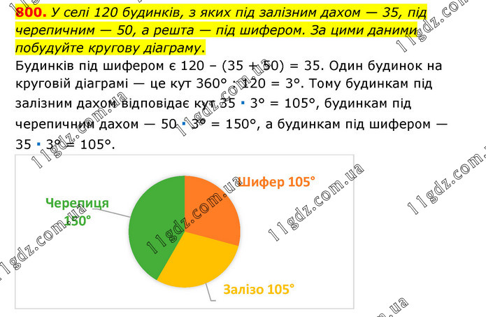 У селі 120 будинків, з яких під залізним дахом — 35, під черепичним — 50, а решта — під шифером. За цими даними побудуйте кругову діаграму. Будинків під шифером є 120 – (35 + 50) = 35. Один будинок на круговій діаграмі — це кут 360° : 120 = 3°. Тому будинкам під залізним дахом відповідає кут 35 ∙ 3° = 105°, будинкам під черепичним дахом — 50 ∙ 3° = 150°, а будинкам під шифером — 35 ∙ 3° = 105°.