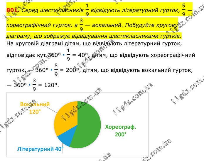 Серед шестикласників 1/9 відвідують літературний гурток, 5/9 — хореографічний гурток, а 3/9 — вокальний. Побудуйте кругову діаграму, що зображує відвідування шестикласниками гуртків. На круговій діаграмі дітям, що відвідують літературний гурток, відповідає кут 360° ∙ 1/9 = 40°, дітям, що відвідують хореографічний гурток, — 360° ∙ 5/9 = 200°, дітям, що відвідують вокальний гурток, — 360° ∙ 3/9 = 120°.