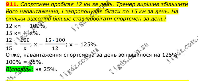 Спортсмен пробігає 12 км за день. Тренер вирішив збільшити його навантаження, і запропонував бігати по 15 км за день. На скільки відсотків більше став пробігати спортсмен за день? 12 км — 100%, 15 км — х%. 12/15 = 100/х; х = (15 • 100)/12; х = 125%. Отже, навантаження спортсмена за день збільшилося на 125% — 100% = 25%. Відповідь: на 25%.