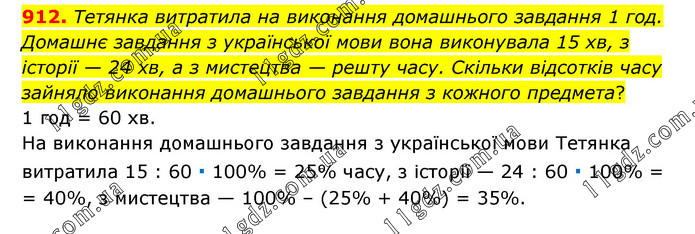 Тетянка витратила на виконання домашнього завдання 1 год. Домашнє завдання з української мови вона виконувала 15 хв, з історії — 24 хв, а з мистецтва — решту часу. Скільки відсотків часу зайняло виконання домашнього завдання з кожного предмета? 1 год = 60 хв. На виконання домашнього завдання з української мови Тетянка витратила 15 : 60 ∙ 100% = 25% часу, з історії — 24 : 60 ∙ 100% = = 40%, з мистецтва — 100% – (25% + 40%) = 35%.