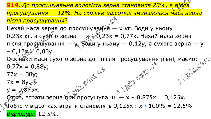 До просушування вологість зерна становила 23%, а після просушування — 12%. На скільки відсотків зменшилася маса зерна після просушування? Нехай маса зерна до просушування — х кг. Води у ньому 0,23х кг, а сухого зерна — х – 0,23х = 0,77х. Нехай маса зерна після просушування — у. Води у ньому — 0,12у, а сухого зерна — у – 0,12у = 0,88у. Оскільки маси сухого зерна до і після просушування рівні, маємо: 0,77х = 0,88у; 77х = 88у; 7х = 8у, у = 0,875х. Отже, втрати зерна при просушуванні — х – 0,875х = 0,125х. Тобто у відсотках втрати становлять 0,125х : х ∙ 100% = 12,5% Відповідь: 12,5%.