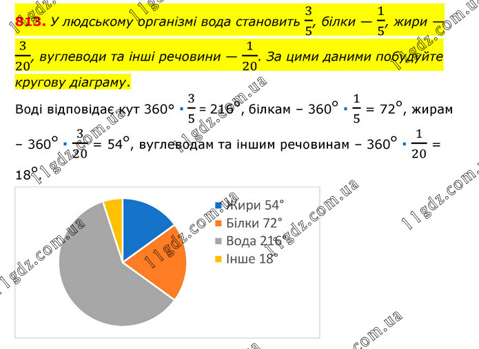 У людському організмі вода становить 3/5, білки — 1/5, жири — 3/20, вуглеводи та інші речовини — 1/20. За цими даними побудуйте кругову діаграму. Воді відповідає кут 360° ∙ 3/5 = 216°, білкам – 360° ∙ 1/5 = 72°, жирам – 360° ∙ 3/20 = 54°, вуглеводам та іншим речовинам – 360° ∙ 1/20 = 18°.
