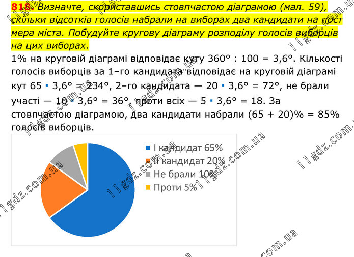 Визначте, скориставшись стовпчастою діаграмою (мал. 59), скільки відсотків голосів набрали на виборах два кандидати на пост мера міста. Побудуйте кругову діаграму розподілу голосів виборців на цих виборах. 1% на круговій діаграмі відповідає куту 360° : 100 = 3,6°. Кількості голосів виборців за 1–го кандидата відповідає на круговій діаграмі кут 65 ∙ 3,6° = 234°, 2–го кандидата — 20 ∙ 3,6° = 72°, не брали участі — 10 ∙ 3,6° = 36°, проти всіх — 5 ∙ 3,6° = 18. За стовпчастою діаграмою, два кандидати набрали (65 + 20)% = 85% голосів виборців.