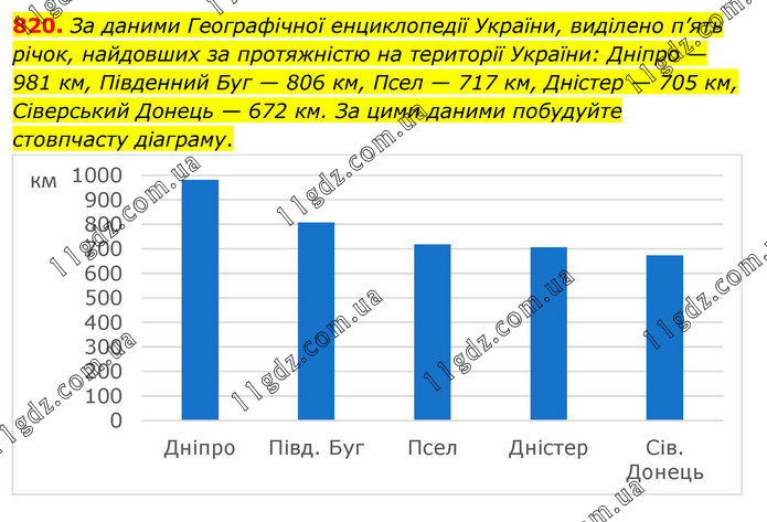 За даними Географічної енциклопедії України, виділено п’ять річок, найдовших за протяжністю на території України: Дніпро — 981 км, Південний Буг — 806 км, Псел — 717 км, Дністер — 705 км, Сіверський Донець — 672 км. За цими даними побудуйте стовпчасту діаграму.