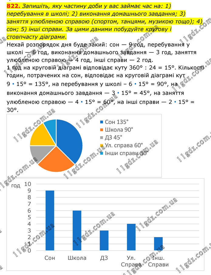 Запишіть, яку частину доби у вас займає час на: 1) перебування в школі; 2) виконання домашнього завдання; 3) заняття улюбленою справою (спортом, танцями, музикою тощо); 4) сон; 5) інші справи. За цими даними побудуйте кругову і стовпчасту діаграми. Нехай розпорядок дня буде такий: сон — 9 год, перебування у школі — 6 год, виконання домашнього завдання — 3 год, заняття улюбленою справою — 4 год, інші справи — 2 год. 1 год на круговій діаграмі відповідає куту 360° : 24 = 15°. Кількості годин, потрачених на сон, відповідає на круговій діаграмі кут 9 ∙ 15° = 135°, на перебування у школі – 6 ∙ 15° = 90°, на виконання домашнього завдання — 3 ∙ 15° = 45°, на заняття улюбленою справою — 4 ∙ 15° = 60°, на інші справи — 2 ∙ 15° = 30°.
