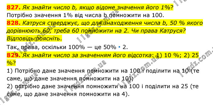 827. Як знайти число b, якщо відоме значення його 1%? Потрібно значення 1% від числа b помножити на 100. 828. Катруся стверджує, що для знаходження числа b, 50 % якого дорівнюють 60, треба 60 помножити на 2. Чи права Катруся? Відповідь поясніть. Так, права, оскільки 100% — це 50% ∙ 2. 829. Як знайти число за значенням його відсотка: 1) 10 %; 2) 25 %? 1) Потрібно дане значення помножити на 100 і поділити на 10 (те саме, що дане значення помножити на 10); 2) потрібно дане значення помножити на 100 і поділити на 25 (те саме, що дане значення помножити на 4).
