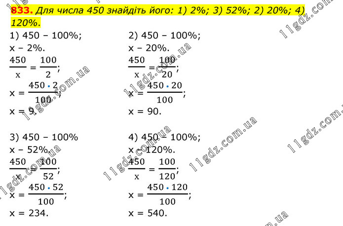 Для числа 450 знайдіть його: 1) 2%; 3) 52%; 2) 20%; 4) 120%. 1) 450 – 100%; х – 2%. 450/х = 100/2; х = (450 • 2)/100; х = 9. 2) 450 – 100%; х – 20%. 450/х = 100/20; х = (450 • 20)/100; х = 90. 3) 450 – 100% х – 52%. 450/х = 100/52; х = (450 • 52)/100; х = 234. 4) 450 – 100%; х – 120%. 450/х = 100/120; х = (450 • 120)/100; х = 540.