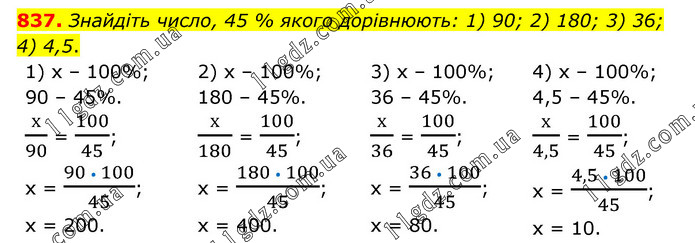 Знайдіть число, 45 % якого дорівнюють: 1) 90; 2) 180; 3) 36; 4) 4,5. 1) х – 100%; 90 – 45%. х/90 = 100/45; х = (90 • 100)/45; х = 200. 2) х – 100%; 180 – 45%. х/180 = 100/45; х = (180 • 100)/45; х = 400. 3) х – 100%; 36 – 45%. х/36 = 100/45; х = (36 • 100)/45; х = 80. 4) х – 100%; 4,5 – 45%. х/4,5 = 100/45; х = (4,5 • 100)/45; х = 10.