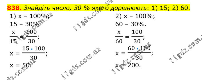 Знайдіть число, 30 % якого дорівнюють: 1) 15; 2) 60. 1) х – 100%; 15 – 30%. х/15 = 100/30; х = (15 • 100)/30; х = 50. 2) х – 100%; 60 – 30%. х/60 = 100/30; х = (60 • 100)/30; х = 200.