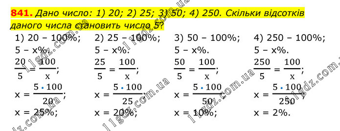 Дано число: 1) 20; 2) 25; 3) 50; 4) 250. Скільки відсотків даного числа становить число 5? 1) 20 – 100%; 5 – х%. 20/5 = 100/х; х = (5 • 100)/20; х = 25%; 2) 25 – 100%; 5 – х%. 25/5 = 100/х; х = (5 • 100)/25; х = 20%; 3) 50 – 100%; 5 – х%. 50/5 = 100/х; х = (5 • 100)/50; х = 10%; 4) 250 – 100%; 5 – х%. 250/5 = 100/х; х = (5 • 100)/250; х = 2%.