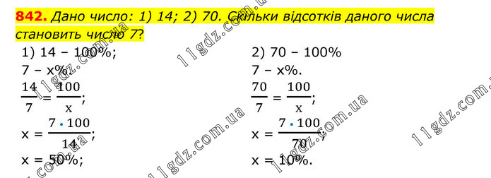 Дано число: 1) 14; 2) 70. Скільки відсотків даного числа становить число 7? 1) 14 – 100%; 7 – х%. 14/7 = 100/х; х = (7 • 100)/14; х = 50%; 2) 70 – 100% 7 – х%. 70/7 = 100/х; х = (7 • 100)/70; х = 10%.
