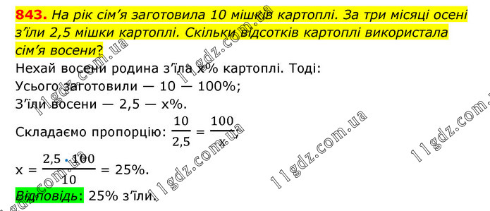 На рік сім’я заготовила 10 мішків картоплі. За три місяці осені з’їли 2,5 мішки картоплі. Скільки відсотків картоплі використала сім’я восени? Нехай восени родина з’їла х% картоплі. Тоді: Усього заготовили — 10 — 100%; З’їли восени — 2,5 — х%. Складаємо пропорцію: 10/2,5 = 100/х; х = (2,5 • 100)/10 = 25%. Відповідь: 25% з’їли.