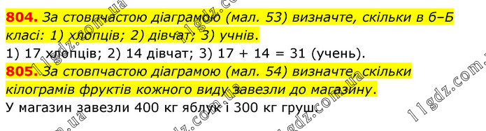 804. За стовпчастою діаграмою (мал. 53) визначте, скільки в б–Б класі: 1) хлопців; 2) дівчат; 3) учнів. 1) 17 хлопців; 2) 14 дівчат; 3) 17 + 14 = 31 (учень). 805. За стовпчастою діаграмою (мал. 54) визначте, скільки кілограмів фруктів кожного виду завезли до магазину. У магазин завезли 400 кг яблук і 300 кг груш.