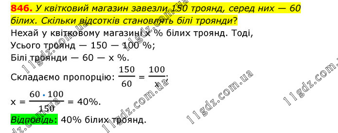 У квітковий магазин завезли 150 троянд, серед них — 60 білих. Скільки відсотків становлять білі троянди? Нехай у квітковому магазині х % білих троянд. Тоді, Усього троянд — 150 — 100 %; Білі троянди — 60 — х %. Складаємо пропорцію: 150/60 = 100/х; х = (60 • 100)/150 = 40%. Відповідь: 40% білих троянд.