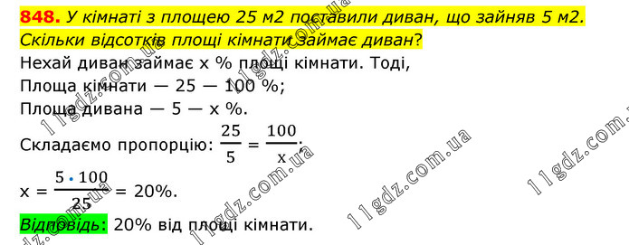 У кімнаті з площею 25 м2 поставили диван, що зайняв 5 м2. Скільки відсотків площі кімнати займає диван? Нехай диван займає х % площі кімнати. Тоді, Площа кімнати — 25 — 100 %; Площа дивана — 5 — х %. Складаємо пропорцію: 25/5 = 100/х; х = (5 • 100)/25 = 20%. Відповідь: 20% від площі кімнати.