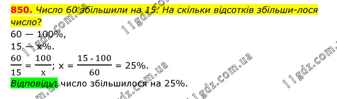 Число 60 збільшили на 15. На скільки відсотків збільшилося число? 60 — 100%, 15 — х%. 60/15 = 100/х; х = (15 • 100)/60 = 25%. Відповідь: число збільшилося на 25%.