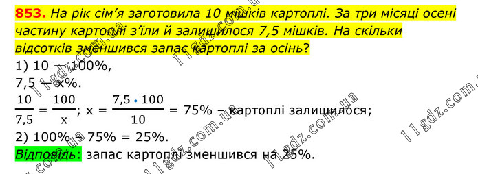На рік сім’я заготовила 10 мішків картоплі. За три місяці осені частину картоплі з’їли й залишилося 7,5 мішків. На скільки відсотків зменшився запас картоплі за осінь? 1) 10 — 100%, 7,5 — х%. 10/7,5 = 100/х; х = (7,5 • 100)/10 = 75% – картоплі залишилося; 2) 100% – 75% = 25%. Відповідь: запас картоплі зменшився на 25%.