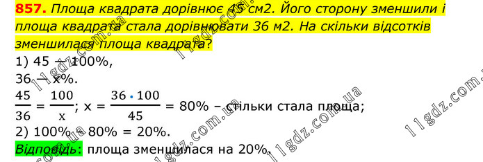 Площа квадрата дорівнює 45 см2. Його сторону зменшили і площа квадрата стала дорівнювати 36 м2. На скільки відсотків зменшилася площа квадрата? 1) 45 — 100%, 36 — х%. 45/36 = 100/х; х = (36 • 100)/45 = 80% – стільки стала площа; 2) 100% – 80% = 20%. Відповідь: площа зменшилася на 20%.