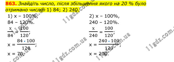 Знайдіть число, після збільшення якого на 20 % було отримано число: 1) 84; 2) 240. 1) х – 100%, 84 – 120%. х/84 = 100/120; х = (84 • 100)/120; х = 70; 2) х – 100%, 240 – 120%. х/240 = 100/120; х = (240 • 100)/120; х = 200.