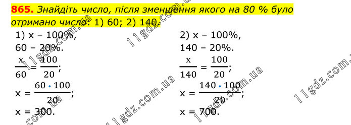 Знайдіть число, після зменшення якого на 80 % було отримано число: 1) 60; 2) 140. 1) х – 100%, 60 – 20%. х/60 = 100/20; х = (60 • 100)/20; х = 300. 2) х – 100%, 140 – 20%. х/140 = 100/20; х = (140 • 100)/20; х = 700.