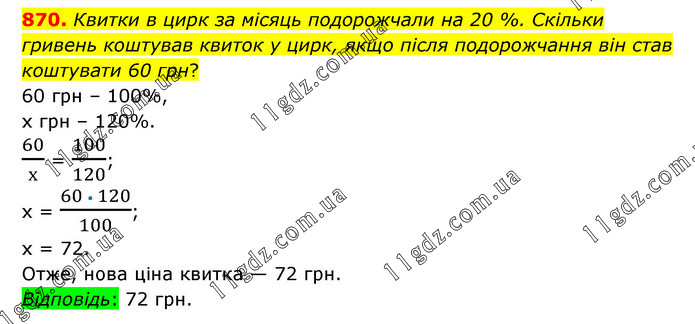 Квитки в цирк за місяць подорожчали на 20 %. Скільки гривень коштував квиток у цирк, якщо після подорожчання він став коштувати 60 грн? 60 грн – 100%, х грн – 120%. 60/х = 100/120; х = (60 • 120)/100; х = 72. Отже, нова ціна квитка — 72 грн. Відповідь: 72 грн.