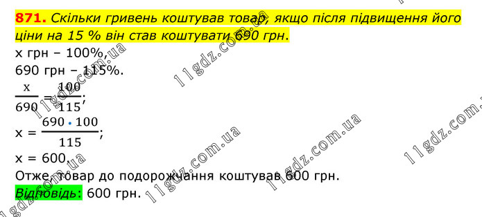 Скільки гривень коштував товар, якщо після підвищення його ціни на 15 % він став коштувати 690 грн. х грн – 100%, 690 грн – 115%. х/690 = 100/115; х = (690 • 100)/115; х = 600. Отже, товар до подорожчання коштував 600 грн. Відповідь: 600 грн.