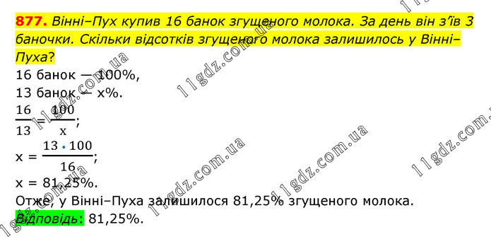 Вінні–Пух купив 16 банок згущеного молока. За день він з’їв 3 баночки. Скільки відсотків згущеного молока залишилось у Вінні–Пуха? 16 банок — 100%, 13 банок — х%. 16/13 = 100/х; х = (13 • 100)/16; х = 81,25%. Отже, у Вінні–Пуха залишилося 81,25% згущеного молока. Відповідь: 81,25%.