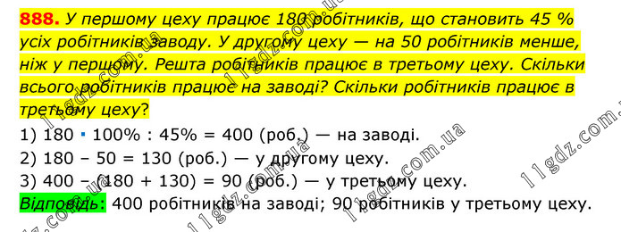 У першому цеху працює 180 робітників, що становить 45 % усіх робітників заводу. У другому цеху — на 50 робітників менше, ніж у першому. Решта робітників працює в третьому цеху. Скільки всього робітників працює на заводі? Скільки робітників працює в третьому цеху? 1) 180 ∙ 100% : 45% = 400 (роб.) — на заводі. 2) 180 – 50 = 130 (роб.) — у другому цеху. 3) 400 – (180 + 130) = 90 (роб.) — у третьому цеху. Відповідь: 400 робітників на заводі; 90 робітників у третьому цеху.