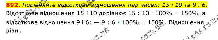 Порівняйте відсоткове відношення пар чисел: 15 і 10 та 9 і 6. Відсоткове відношення 15 і 10 дорівнює 15 : 10 ∙ 100% = 150%, а відсоткове відношення 9 і 6: — 9 : 6 ∙ 100% = 150%. Відношення рівні.