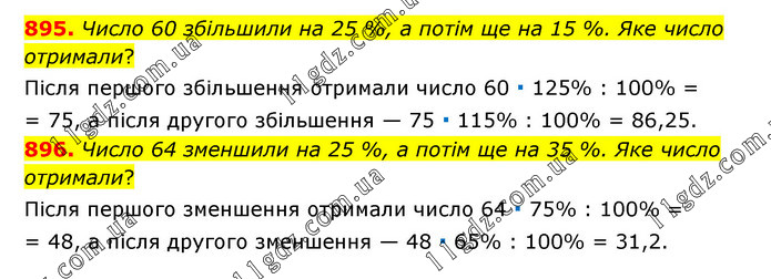 895. Число 60 збільшили на 25 %, а потім ще на 15 %. Яке число отримали? Після першого збільшення отримали число 60 ∙ 125% : 100% = 75, а після другого збільшення — 75 ∙ 115% : 100% = 86,25. 896. Число 64 зменшили на 25 %, а потім ще на 35 %. Яке число отримали? Після першого зменшення отримали число 64 ∙ 75% : 100% = 48, а після другого зменшення — 48 ∙ 65% : 100% = 31,2.