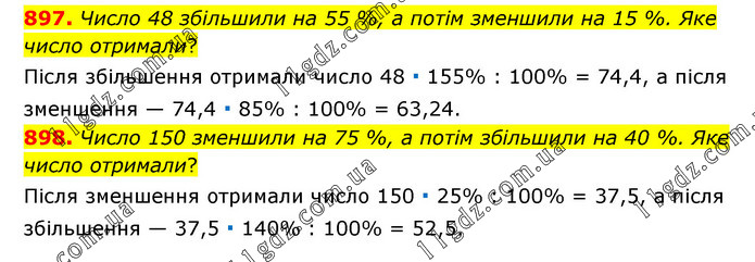 897. Число 48 збільшили на 55 %, а потім зменшили на 15 %. Яке число отримали? Після збільшення отримали число 48 ∙ 155% : 100% = 74,4, а після зменшення — 74,4 ∙ 85% : 100% = 63,24. 898. Число 150 зменшили на 75 %, а потім збільшили на 40 %. Яке число отримали? Після зменшення отримали число 150 ∙ 25% : 100% = 37,5, а після збільшення — 37,5 ∙ 140% : 100% = 52,5.