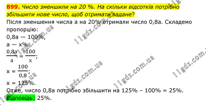 Число зменшили на 20 %. На скільки відсотків потрібно збільшити нове число, щоб отримати задане? Після зменшення числа а на 20% отримали число 0,8а. Складемо пропорцію: 0,8а — 100%, а — х%. 0,8а/а = 100/х; х = 100/0,8; х = 125%. Отже, число 0,8а потрібно збільшити на 125% – 100% = 25%. Відповідь: 25%.