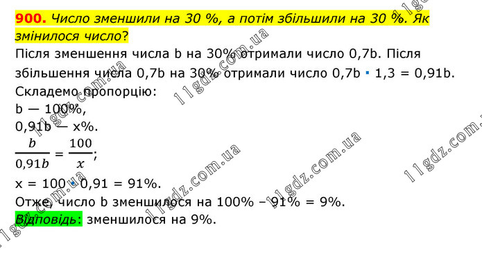 Число зменшили на 30 %, а потім збільшили на 30 %. Як змінилося число? Після зменшення числа b на 30% отримали число 0,7b. Після збільшення числа 0,7b на 30% отримали число 0,7b ∙ 1,3 = 0,91b. Складемо пропорцію: b — 100%, 0,91b — х%. b/0,91b = 100/x; x = 100 ∙ 0,91 = 91%. Отже, число b зменшилося на 100% – 91% = 9%. Відповідь: зменшилося на 9%.