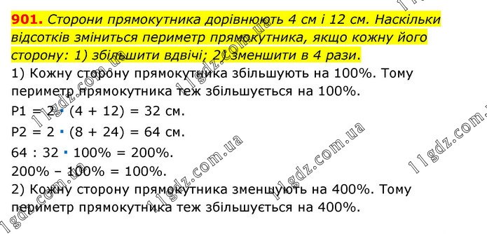 Сторони прямокутника дорівнюють 4 см і 12 см. Наскільки відсотків зміниться периметр прямокутника, якщо кожну його сторону: 1) збільшити вдвічі; 2) зменшити в 4 рази. 1) Кожну сторону прямокутника збільшують на 100%. Тому периметр прямокутника теж збільшується на 100%. Р1 = 2 ∙ (4 + 12) = 32 см. Р2 = 2 ∙ (8 + 24) = 64 см. 64 : 32 ∙ 100% = 200%. 200% – 100% = 100%. 2) Кожну сторону прямокутника зменшують на 400%. Тому периметр прямокутника теж збільшується на 400%.