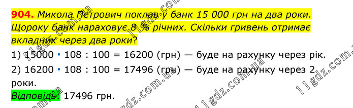 Микола Петрович поклав у банк 15 000 грн на два роки. Щороку банк нараховує 8 % річних. Скільки гривень отримає вкладник через два роки? 1) 15000 ∙ 108 : 100 = 16200 (грн) — буде на рахунку через рік. 2) 16200 ∙ 108 : 100 = 17496 (грн) — буде на рахунку через 2 роки. Відповідь: 17496 грн.