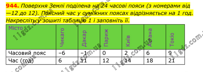 Поверхня Землі поділена на 24 часові пояси (з номерами від —12 до 12). Поясний час у суміжних поясах відрізняється на 1 год. Накресліть у зошиті таблицю 1 і заповніть її.