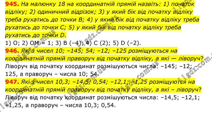 945. Ha малюнку 18 на координатній прямій назвіть: 1) початок відліку; 2) одиничний відрізок; 3) у який бік від початку відліку треба рухатись до точки В; 4) у який бік від початку відліку треба рухатись до точки С; 5) у який бік від початку відліку треба рухатись до точки D. 1) О; 2) OM = 1; 3) B (–4); 4) C (2); 5) D (–2). 946. Які з чисел 10; –145; 54; –12; –125 розміщуються на координатній прямій праворуч від початку відліку, а які — ліворуч? Ліворуч від початку координат розмішуються числа: –145; –12; –125, а праворуч – числа 10; 54. 947. Які з чисел 10,3; –14,5; 0,54; –12,1; –1,25 розміщуются на координатній прямій праворуч від початку відліку, а які – ліворуч? Ліворуч від початку координат розмішуються числа: –14,5; –12,1; –1,25, а праворуч – числа 10,3; 0,54.