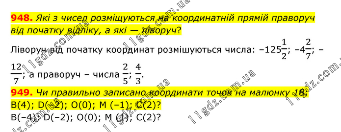 948. Які з чисел розміщуються на координатній прямій праворуч від початку відліку, а які — ліворуч? Ліворуч від початку координат розмішуються числа: –1251/2; –42/7; –12/7; а праворуч – числа 2/5; 4/3. 949. Чи правильно записано координати точок на малюнку 18: В(4); D(–2); О(0); М (–1); С(2)? В(–4); D(–2); О(0); М (1); С(2)?