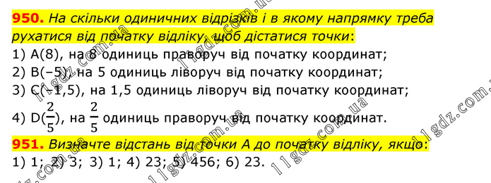 950. На скільки одиничних відрізків і в якому напрямку треба рухатися від початку відліку, щоб дістатися точки: 1) А(8), на 8 одиниць праворуч від початку координат; 2) В(–5), на 5 одиниць ліворуч від початку координат; 3) С(–1,5), на 1,5 одиниць ліворуч від початку координат; 4) D(2/5), на 2/5 одиниць праворуч від початку координат. 951. Визначте відстань від точки А до початку відліку, якщо: 1) 1; 2) 3; 3) 1; 4) 23; 5) 456; 6) 23.