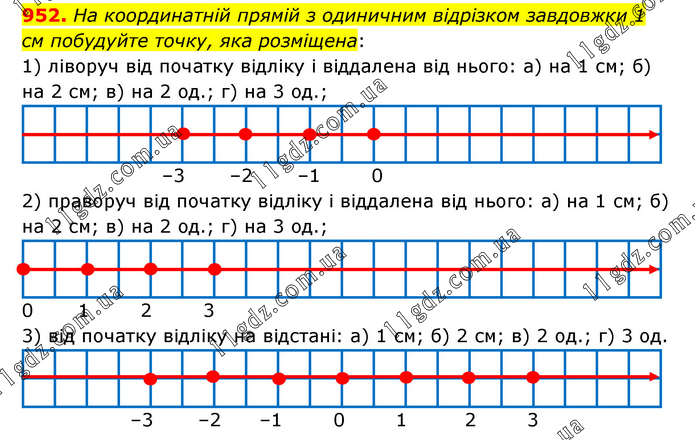 На координатній прямій з одиничним відрізком завдовжки 1 см побудуйте точку, яка розміщена: 1) ліворуч від початку відліку і віддалена від нього: а) на 1 см; б) на 2 см; в) на 2 од.; г) на 3 од.; 2) праворуч від початку відліку і віддалена від нього: а) на 1 см; б) на 2 см; в) на 2 од.; г) на 3 од.; 3) від початку відліку на відстані: а) 1 см; б) 2 см; в) 2 од.; г) 3 од.