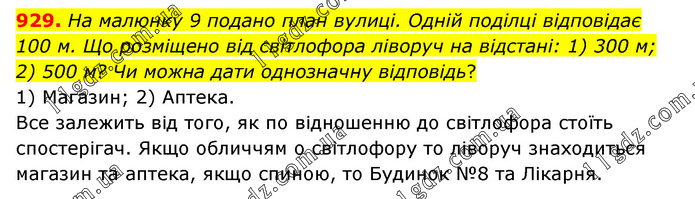 На малюнку 9 подано план вулиці. Одній поділці відповідає 100 м. Що розміщено від світлофора ліворуч на відстані: 1) 300 м; 2) 500 м? Чи можна дати однозначну відповідь? 1) Магазин; 2) Аптека. Все залежить від того, як по відношенню до світлофора стоїть спостерігач. Якщо обличчям о світлофору то ліворуч знаходиться магазин та аптека, якщо спиною, то Будинок №8 та Лікарня.